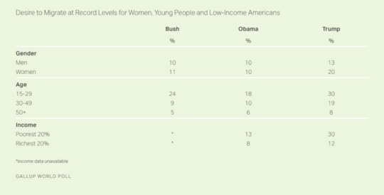 According to Gallup’s Julie Ray and Neli Esipova, what they refer to as the “Trump effect” has become “a new manifestation of the increasing political polarization” in the country and is influencing at least some people’s desire to leave. “Before Trump took office, Americans’ approval or disapproval of the president was not a push factor in their desire to migrate.”
