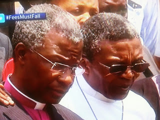 Bishop Malusi Mpumlwana, General Secretary of the South African Council of Churches (right) comforts Archbishop ThaboArchbishop Thabo commented, “As parents we find it difficult to hold back our tears. This is a hard one… they are kids. We had a wonderful conversation with him and I told him welcome to adulthood, and I have to be strong for him,” He added, “I told him be strong, and not forget dad wants you to have a social conscience and equally to pass.”