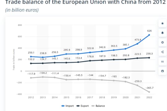 But let get this right: the EU trade deficit with China has risen from $40bn to $400bn in 20 years! Not two years, not five years, not ten years, but throughout this century. First, that makes the rise in the deficit not so large per year, say about $10-15bn and throughout that period, we heard little complaint from the EU that China was adopting unfair trade practices. Suddenly after the debacle of rising energy costs after cutting off Russian energy imports and a virtual two-year recession in the major EU countries, von der Leyen now blames China. Indeed, most of the increase in the ‘China deficit’ has come in the post-pandemic period.