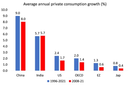But this is just not true. A low consumption to GDP ratio does not necessarily mean low consumption growth. And China’s consumption growth has been way faster than the consumer-led economies of the West.