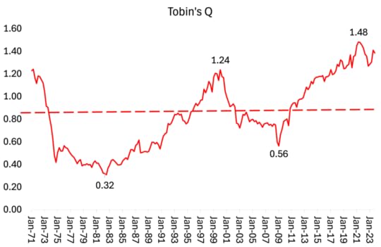 The leftist economist, James Tobin developed a measure of the relation between the market capitalisation’ of the companies in the stock market (in this case the top 500 companies in what is called the S&P-500 index) and divided that by the replacement value of tangible assets accumulated by those companies. The replacement value is the price that companies would have to pay to replace all the physical assets that they own (plant, equipment etc). This is called Tobin’s Q. The current Tobin’s Q reveals that US company shares are valued way above the actual value of the assets that companies own at a ratio of 1.48 compared to the historic average of 0.83.