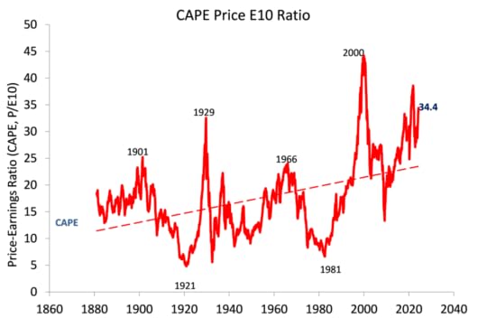 It shows a value well above the trend average measure of stock price to earnings, surpassing the 1929 level with only 2000 being higher, just before the dot.com bust when the great hopes of the internet revolution eventually did not deliver sufficiently higher real earnings and the tech bubble burst.