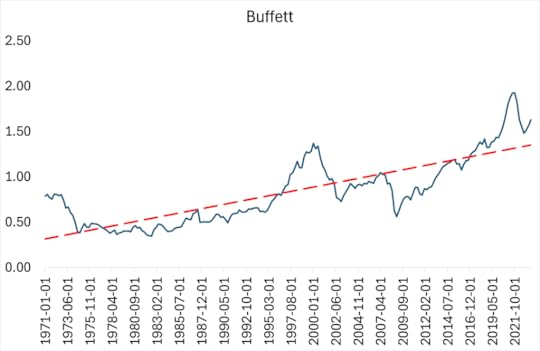 Another measure of the stock market’s relation to reality is favoured by the legendary billionaire investor, Warren Buffett. Buffett monitors the market cap of the US stock market against real GDP, in other words, stock prices versus the real economy. Here is the Buffett measure. Again, it is well above the historic trend growth rate.