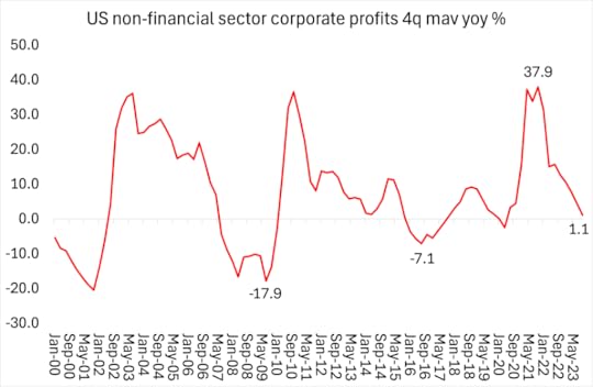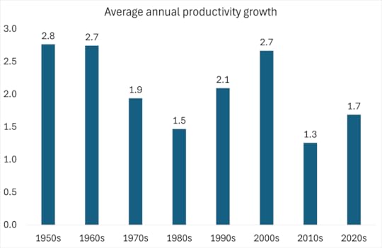 Much of the recent growth in the US economy has been achieved by large increases in immigration. But from here, if the US economy will only avoid stagnation if productivity growth picks up. Moreover, what will keep inflation down would be a rise in output per worker per hour, ie an increase in new value. Up to now, US productivity growth in the 2020s has remained relatively moderate.