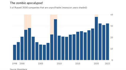 If inflation stays ‘sticky’ or even rises, then the Fed will hold off cutting its policy rate and borrowing costs will stay high. That will eat into net profits of most companies that are already struggling. The risk of bankruptcies among so-called ‘zombie’ companies will increase.