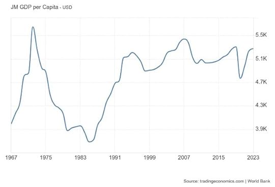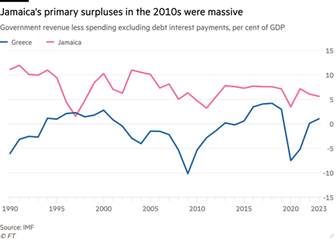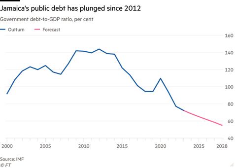 The alternative solution offered to countries in serious debt to foreigners is to cut public spending and raise taxes to obtain sufficient budget surpluses for repay the debt – in other words, fiscal austerity. Take Jamaica, a tiny island state. Recently, Jamaica has been heralded by mainstream economists as a great success story in paying down its debt, halving its government debt to GDP ratio from 144% in 2012 to 2023.