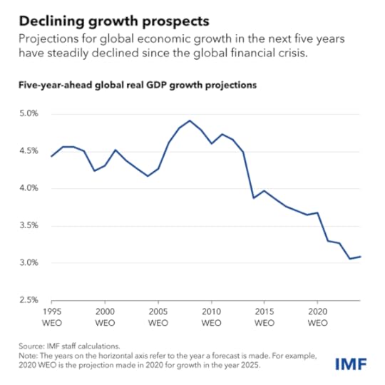 It makes for sober reading. Let me quote: “Faced with several headwinds, future growth prospects have also soured. Global growth will slow to just above 3 percent by 2029, according to five-year ahead projections. Our analysis shows that growth could drop by about a percentage point below the pre-pandemic (2000-19) average by the end of the decade. This threatens to reverse improvements to living standards, and the unevenness of the slowdown between richer and poorer nations could limit the prospects for global income convergence.”