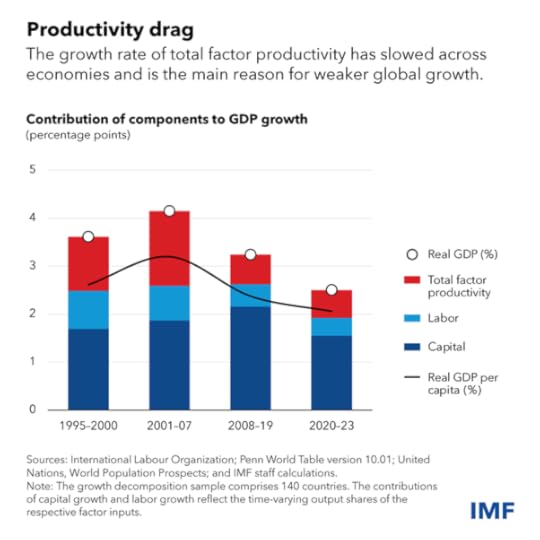 The IMF is making it starkly clear that the capitalist mode of production is failing to deliver on increased productivity, essential to meet the social needs of 8bn humans. And why? First, because innovation is fading. In mainstream economics, this is measured by what is called total factor productivity (TFP), the amount of productivity that cannot be explained by investment in means of production or in employing labour – it’s a residual to complete the total level of productivity. In this decade so far, global TFP growth has slowed to its lowest rate since the 1980s.