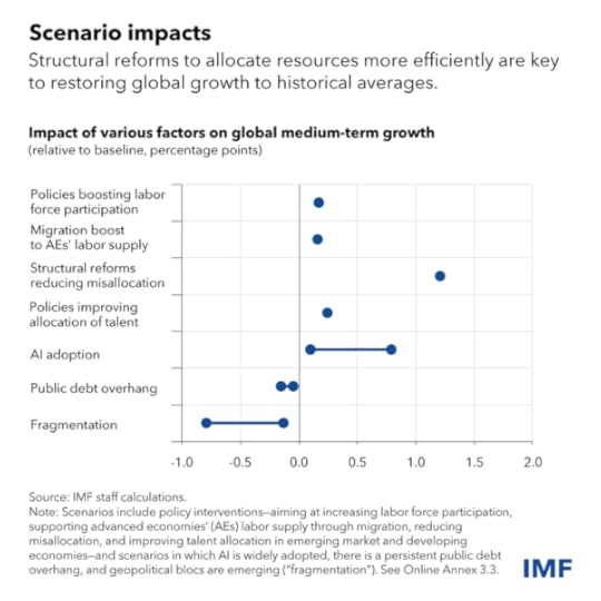 As for AI, the IMF says: “the potential of AI to boost labor productivity is uncertain but potentially substantial as well, possibly adding up to 0.8 percentage points to global growth, depending on its adoption and impact on the workforce.” Depending on a lot then.