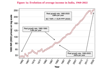 The WID averaged out national income growth between rich and poor. On that measure, growth in incomes in India is nowhere near the hype levels surrounding real GDP growth. Average real income growth in India is around 3.6% a year compared to the 6-8% claimed for real GDP growth.