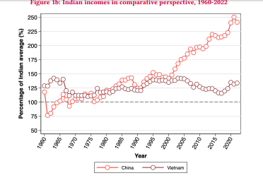 The idea that India is or will close the gap with China is a pipedream. Here the WID paper shows the gap between China’s average income, and that of India and Vietnam. Even Vietnam is holding its advantage over India.