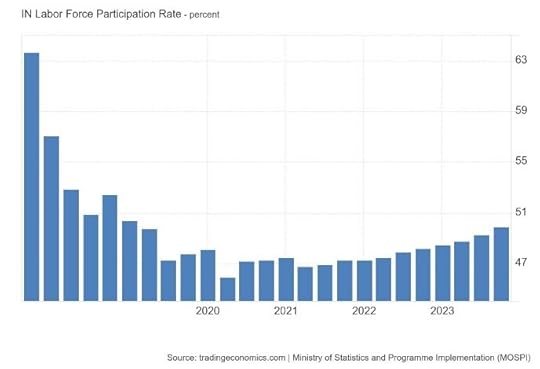 The Indian economy is failing to create jobs, especially those that would support a dignified standard of living. Apart from public administration, the most rapid income growth by far this past quarter (at 12.1%) was in finance and real estate. But this neo-liberal feature of Indian development, now augmented by “fintechs,” generates only a handful of jobs for highly qualified Indians. Among other growth sectors, construction (helped by the government’s infrastructure drive) and low-end services (in trade, transport, and hotels) mostly create financially precarious jobs that leave workers one life event away from severe distress. The labour force participation rate in India has declined over the last 15 years. Under Modi, less than half the adult working population is employed.