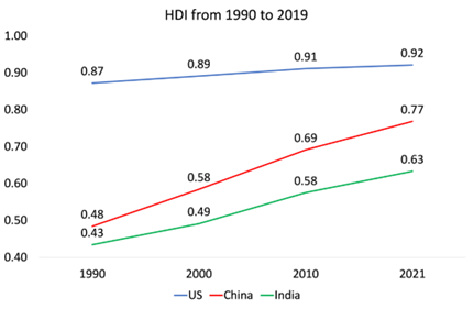 One good measure of a better life is the World Bank’s Human Development Index (HDI). The HDI covers economic growth, life expectancy and educational attainment. If we look at the largest so-called emerging economies by population, including the BRICS (Brazil, Russia, India, China and South Africa), China has achieved the greatest improvement in its HDI of all countries. From a lowly 0.48 in 1990, China’s HDI reached 0.77 in 2021, a rise of 59%. Compare that to India, which started pretty much at the same HDI as China but reached only 0.63 in 2021, a rise of 46% but still way less than China.