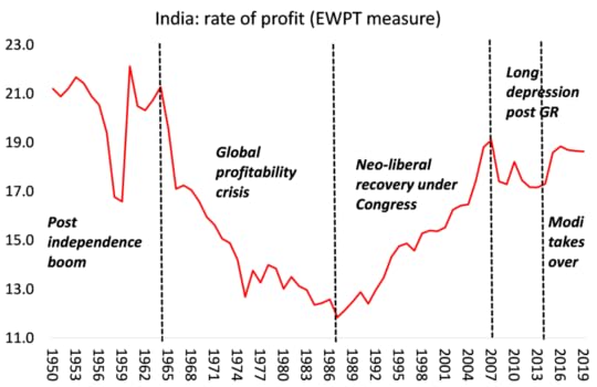 The key for Indian capitalism is the profitability of its business sector. The profitability of Indian capital took a huge plunge in the 1970s, as profitability did globally. Under successive Congress-led governments, neo-liberal policies were adopted to drive up profitability. Then came the Great Recession and the ensuing Long Depression and profitability and growth began to fall back.