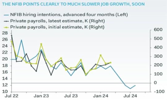 Also, the jobs market is beginning to look frailer. Sure, the official US unemployment rate is still below 4% (3.9%), but job hiring by US companies is dropping off, particularly among small firms as the National Federation of Independent Businesses survey of hiring intentions shows. And the NFIB survey seems a good forward indicator of jobs growth.