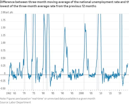 Back last November former NY Fed chief, William Dudley commented: “does the unemployment rate have to rise to 4.25-4.5 per cent for the Fed to achieve their “final mile” on getting inflation back down to 2 per cent? If you think it does, then a hard landing is highly likely.” Claudia Sahm, another former Fed economist reckons that if the unemployment rate runs some 0.5% pts above the bottom for three months, it is a very strong indicator of a recession in output. Currently, this Sahm indicator is now 0.36 pp above the lowest such reading for the previous 12 months. So not yet at the ‘recession’ threshold, but closing in.