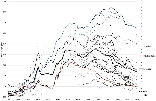 If we look at the development of unionisation in 30 industrial countries over the last 130 years of capitalism, we can observe something like an inverted U-curve, with the peaks of maximum expansion of unionization between 1950 and 1980.