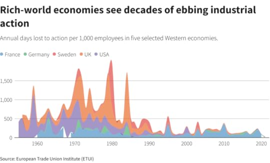 As a result of the weakening of collective labour organizations, workers’ ability to defend their rights at work and gain better wages and conditions has also fallen back. Industrial dispute levels have dropped sharply. Prior to the pandemic slump of 2020, annual days lost due to industrial disputes in the major ‘rich’ economies were near record lows.
