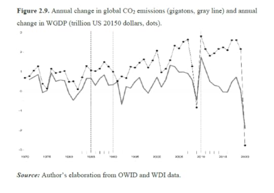 There are two more contributions that Tapia makes to understanding of modern crises. The first is the relation of economic growth to carbon emissions. Economic growth is directly linked to the growth of emissions; indeed, crises of the world economy are the only periods in the past half-century in which the steady growth in global emissions of CO2 has slowed down. For instance, when the world economy contracted by 0.83 trillion dollars in 2009, emissions of CO2 contracted by 0.46 gigatons. Even more dramatically, in 2020 the world economy contracted by 2.8 trillion dollars while emissions dropped by 1.9 gigatons.