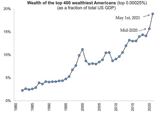 In the 21st century, inequality of wealth has risen significantly. Indeed, the wealth of the 50 richest people on earth increased by 9% a year between 1995 and 2021, with the wealth of the richest 500 rising by 7% a year. Average wealth grew by less than half that rate, at 3.2% over the same period. Since 1995 the top 1% took 38% of all additional global wealth in the last 25 years, whereas the bottom 50% captured just 2% of it. The rise of the so-called middle class income group in the graph below is mostly due to China’s reduction of poverty levels. The top 0.01% of adults increased their share of personal wealth from 7.5% in 1995 to 11% now. And the billionaire population increased their share from 1% to 3.5%.