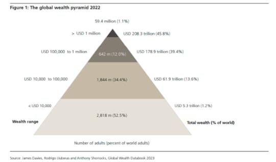 The World Inequality Report (WIR) shows that the world has become more unequal in wealth in the last 40 years. In 2021,“after three decades of trade and financial globalisation, global inequalities remain extremely pronounced … about as great today as they were at the peak of Western imperialism in the early 20th century.” The global concentration of personal wealth is extreme. According to the WIR, the richest 10% of adults in the world own around 60-80% of wealth, while the poorest half have less than 5%. According to the UBS Global wealth report, 1% of all adults in the world own 44.5% of all personal wealth, while more than 52% have only 1.2%. The 1% are 59m, while the 52% are 2.9bn.