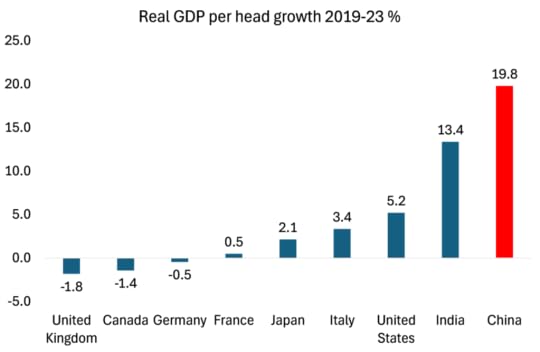 Yes, China’s annual growth rates have slowed from the breakneck pace of the 1990s onwards and the Chinese workforce is declining. But just look the increase in GDP per person that China has achieved compared to the G7 economies since 2019, some of which have even contracted (IMF data). The rise on per capita basis is even higher against the US (nearly four times).