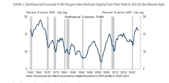 Nevertheless, Goldman Sachs economists are ecstatic at the prospect of profit margins staying up. They reckon that, although average wages are now rising faster than price rises, that will not hit profit margins because as inflation slows, so will interest rates (eventually) and thus the cost of servicing debt will fall to compensate for any squeezing of profits by wages.