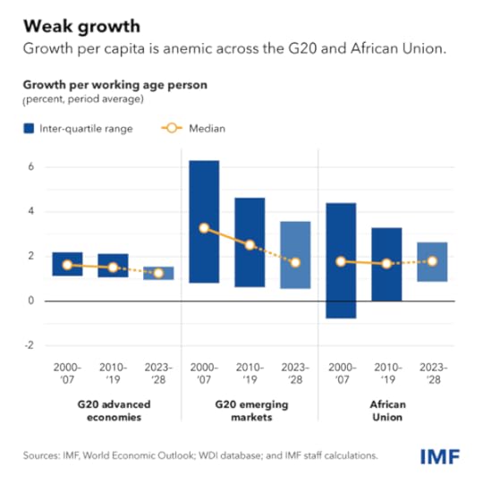 And globalisation is fragmenting along geopolitical lines—around 3,000 trade-restricting measures were imposed in 2023, nearly three times the number in 2019. Georgieva is worried: “Geoeconomic fragmentation is deepening as countries shift trade and capital flows. Climate risks are increasing and already affecting economic performance, from agricultural productivity to the reliability of transportation and the availability and cost of insurance. These risks may hold back regions with the most demographic potential, such as sub-Saharan Africa.”
