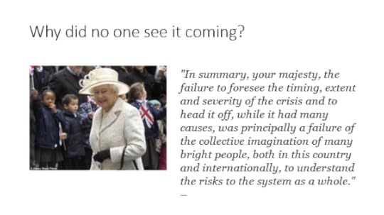 I quote: “Everyone seemed to be doing their own job properly on its own merit. And according to standard measures of success, they were often doing it well. The failure was to see how collectively this added up to a series of interconnected imbalances over which no single authority had jurisdiction.” I think the economists were saying that their theories seemed to be fine but then lots of different things that they knew about somehow all came together in a perfect storm to create the crash and they could not have foreseen that.