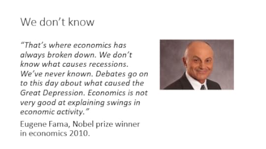 Eugene Fama is another Nobel prize winner in economics. His prize is for showing that markets work efficiently and, as long as you and me and everybody has enough information about what is going on, then the market will ensure full employment, steady growth and rising incomes for all. This is called the Efficient Markets Hypothesis (EMH). After the Great Recession, Fama was asked what went wrong. He replied, “We don’t know what causes recessions. We’ve never known. Debates go on to this day about what caused the Great Depression. Economics is not very good at explaining swings in economic activity”.