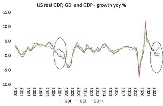 GDP has been growing faster than GDI because there is more consumer borrowing (and running down savings) and because there is more production without sales. So the GDI measure may well be more accurate about what is happening to the US economy than GDP. Over the last four quarters US GDP is up 3.0% while US GDI is down 0.2%.