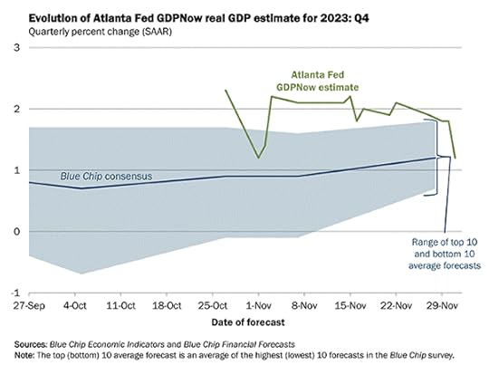 Indeed, the latest forecast by the well-followed Atlanta Fed GDP Now model reckons real GDP growth in this current Q4 quarter is likely to be just 1.2% at an annualised rate, or up only 0.3% on Q3.