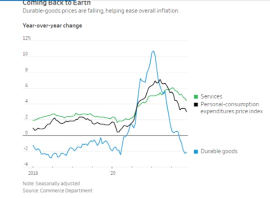 Even Jared Bernstein, the chair of Biden’s Council of Economic Advisers, has acknowledged that, while slowing inflation is “extremely welcome…people want to hear about falling prices, because they remember what prices were, and they want their old prices back.” They are not going to get those old prices back, although it is true that ‘durable goods’ (household appliances etc) prices are falling.