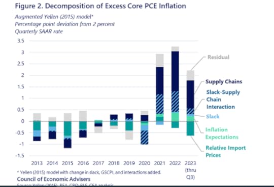 The CEA found that supply chains, either alone or interacted with slack, explain most of the excess core inflation from 2021-23. Likewise, supply chains in some form—either alone (purple bars in Figure 2) or in tandem with slack, xplain more than 80 percent of the disinflation the US has experienced since 2022. By contrast, because the unemployment rate has not changed much since 2022, the model assigns little effect to labor market slack on its own – the latter being the usual Keynesian explanation of inflation.