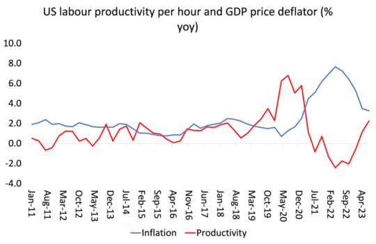 ECB member Isabel Schnabel discussed the ‘last mile’ for Eurozone inflation: “while it took a year to bring inflation from 10.6% to 2.9%, it is expected to take about twice as long to get from here back to 2%.” A key problem is productivity growth. And US treasury secretary Janet Yellen noted what we have discussed on this blog many times. “Over the last decade, U.S. labor productivity growth averaged a mere 1.1 percent—roughly half that during the previous fifty years. This has contributed to slow growth in wages and compensation, with especially slow historical gains for workers at the bottom of the wage distribution.” When productivity growth is low, then the upward pressure on inflation rises as firms try to compensate for higher unit costs with price increases. Once productivity growth picks up, then unit costs do not rise as fast and inflation can subside. This is clearly revealed in the relation between productivity and prices in the US post-pandemic.