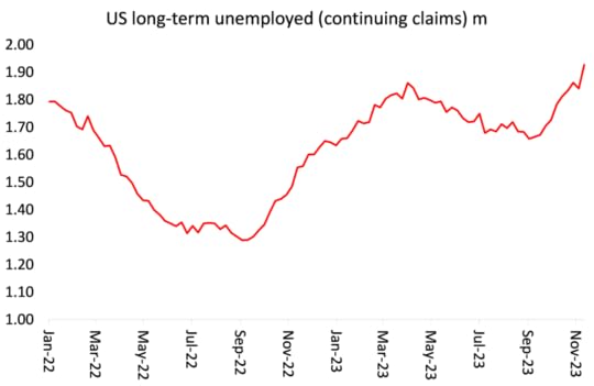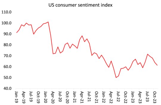 But now the US labour market is cooling off. Job creation is down this year from the high rates of 2022 and the unemployment rate has risen from a more than 50-year low of 3.4% in April to 3.9% in October. And as I pointed out in a previous post, there is a reliable (Sahm) model that argues if the unemployment rate rises more than 50bp for at least three months, then a recession is likely on its way.
