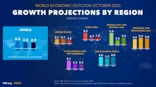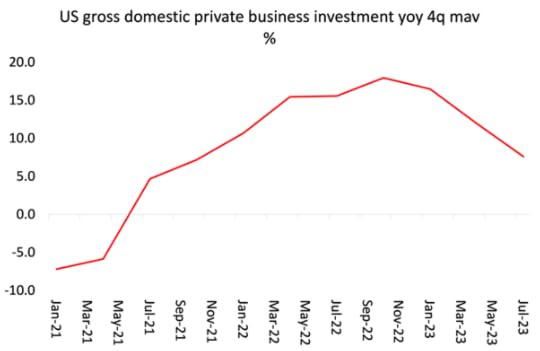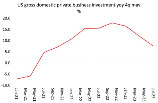 Let’s consider those claims. For a start, the consensus is still for even slower global growth than in 2023. I quote the IMF forecast made in October 2023: “The baseline forecast is for global growth to slow from 3.5 percent in 2022 to 3.0 percent in 2023 and 2.9 percent in 2024, well below the historical (2000–19) average of 3.8 percent. Advanced economies are expected to slow from 2.6 percent in 2022 to 1.5 percent in 2023 and 1.4 percent in 2024 as policy tightening starts to bite. Emerging market and developing economies are projected to have a modest decline in growth from 4.1 percent in 2022 to 4.0 percent in both 2023 and 2024.”