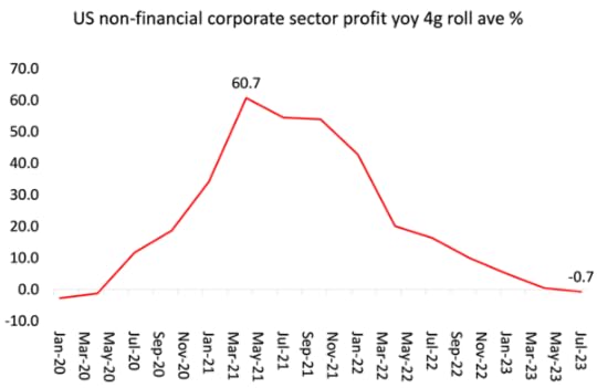 So even if the technology sector is growing and profitable, the rest of US business is not doing so well. Non-financial sector corporate profits are up only 3% on last year so far and are now falling.