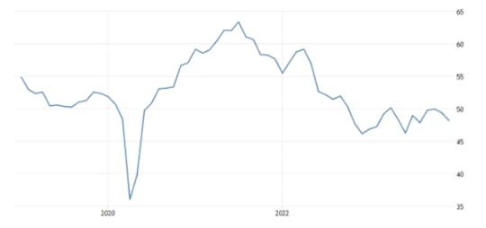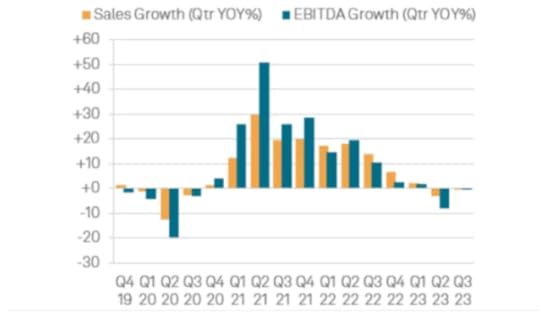 Why the significant difference in 2023? The main reason is that GDP growth has not been transformed into increased sales and revenue at the same rate. Stocks of goods produced have instead built up. US manufacturing industry is in fact mired in the longest slump in more than two decades. Activity in the manufacturing sector has weakened for 13 straight months, the longest stretch since 2002, according to surveys of purchasing managers (PMI) by the Institute for Supply Management.
