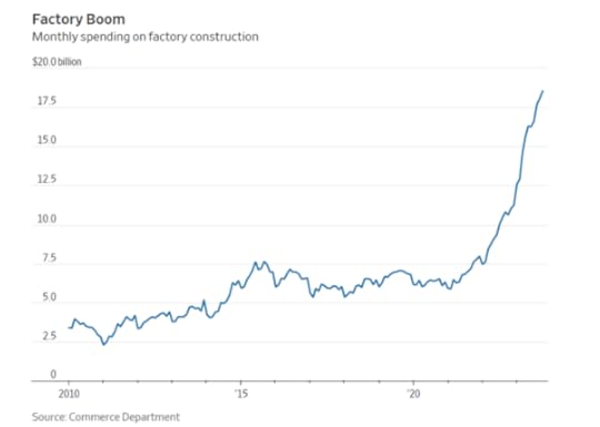 Spending on manufacturing construction (mainly IT) rose almost 40% in 2022 and is up a further 72% through the first 10 months of 2023 versus the same period the previous year.
