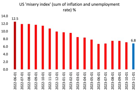 But there seems to be a peak in central bank policy interest rates. So financial markets are now expecting significant reductions during 2024, starting as early as March. Inflation rates are falling everywhere in the major economies and unemployment has not risen – as I showed above. Indeed, the so-called ‘misery index’ (the sum of inflation and unemployment rate) in the US and other major economies has halved 18 months.