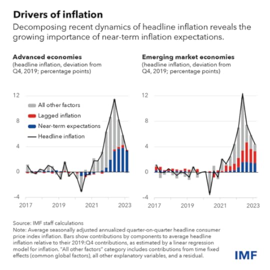 Finally, there was the ‘trendy’ theory of inflation expectations. The IMF under director Gita Gopinath, having seen that monetarist, fiscal and Phillips curves theories don’t explain the recent inflation, have turned to ‘inflation expectations’. The idea is that people think prices are going to rise and so buy more things, thus causing ‘excessive demand’ and thus rising prices. In a recent blog, the IMF economists claim that since 2020, ‘near-term inflation expectations’ have been the biggest driver of price increases in advanced economies and the second biggest factor in emerging markets.