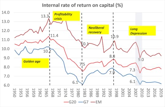 Several studies (including my own) show that the global rate of profit (profitability not profits) has been in secular decline over the last 70 years and in particular since the late 1990s.