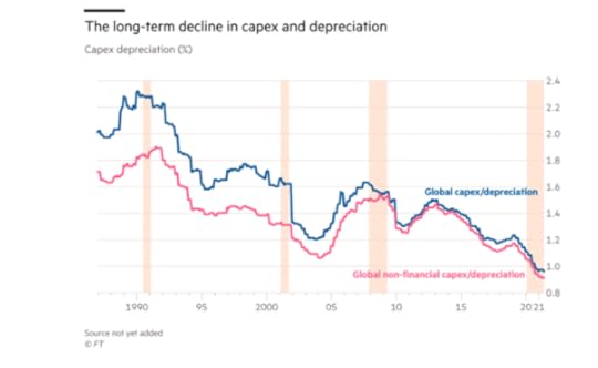 If the theory is right, then falling profitabilty long term should lead to a secular fall in business investment; and Harnett’s global data confirm that. Harnett’s data show that new investment relative to depreciation has declined globally from a multiple of 2 in the 1990s to less than one now. In other words, annual global investment is now less than that needed to replace worn out fixed assets!