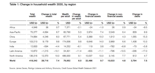 Total global wealth grew by 7.4% and wealth per adult rose by 6% to reach another record high of $79,952. The report finds that “overall, the countries most affected by the pandemic have not fared worse in terms of wealth creation. In short, there is nothing in the chart to suggest that the economic upheaval in 2020 bore any resemblance to that experienced in 2008. Household wealth appears to have simply continued on its way, paying little or no attention to the economic turmoil that should have hampered progress.”