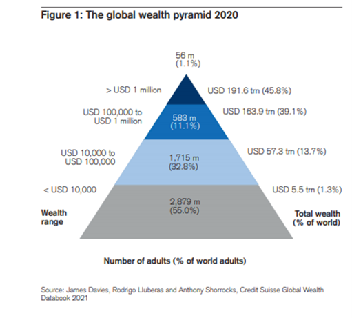 In 2020, if you have personal wealth (financial assets plus property less debt) of over $129,000, you are in the top 10% of global wealth holders and if you had over $1m in wealth, you are in the top 1% in the globe. What that tells you is that there are billions of people with little or no wealth (financial and property) in the world. Inequality of wealth is extreme.