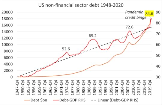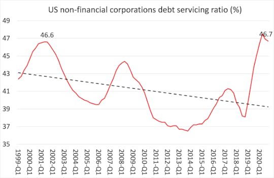 Debt servicing costs have been falling on average even though debt is piling up. That’s because of the sharply falling cost of borrowing. If that scenario should start to reverse, then the possibility of corporate bankruptcies and a financial crash becomes a probability. And the US corporate debt servicing ratio (debt costs to corporate income) has jumped to a 20-year high in the pandemic. And if corporate bankruptcies (currently very low) start to emerge, the banking system may come under pressure.
