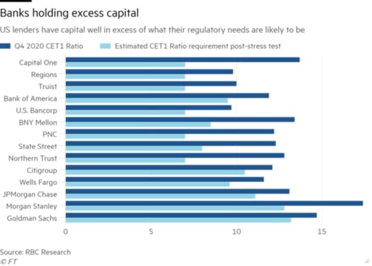 Source: BIS, author’s calculationsRecently, the Federal Reserve conducted a ‘financial stress test’ on US banks. It found that nearly all were in good shape with plenty of spare capital cover any loan losses, certainly compared to before the global financial crash of 2008-9. They were in such good shape, that they could plan to pay shareholders increased dividends and buy back shares to boost prices. However, while the large ‘retail’ banks seemed in good shape, it was less so for the huge investment banks which provide funds for speculation in financial assets and speculate themselves. They are required to have higher capital ratios (capital relative to loans and financial assets) and the gap between the minimum requirement and their ratios is much less.