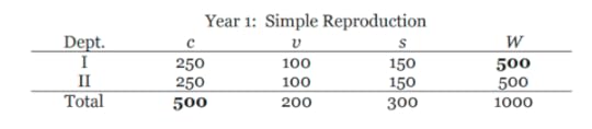 In simple reproduction, Department I (means of production) and Department II (means of consumption) grow at the same (zero) rate. Below is a table taken from the excellent paper on the schema by Andrew Kliman, drawing on the work of Dunayevskaya.