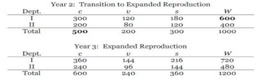 The transition from simple to expanded reproduction requires unbalanced growth. Department I must grow relative to Department II. That does not mean that the consumer goods sector must decline absolutely, except maybe when ‘starting from scratch’ with zero growth. Subsequently, Department II can grow. Indeed, the two departments could then grow at the same rate, as they do in Marx’s own examples of expanded reproduction. But the relative imbalance will persist. Department I will remain relatively larger than Department II under expanded reproduction than under simple reproduction. Thus Marx’s schema show that the departments are never in ‘equilibrium’ if we mean by that that they are both the same size and must grow together at the same pace.